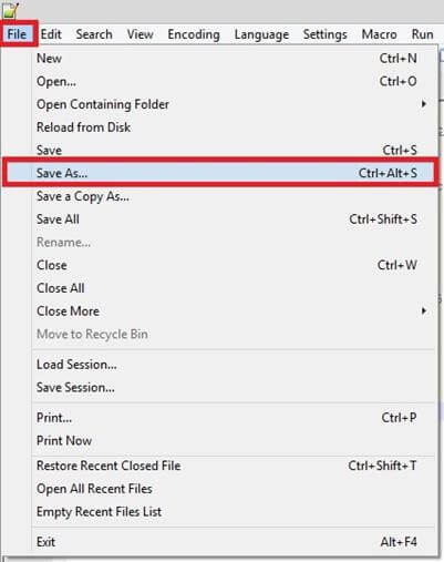c. Save the new Notepad++ file by clicking the File > Save As.