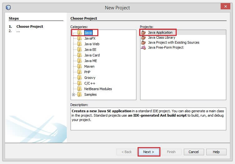 b. Select JAVA from the Categories column and select Java Applications as the Project.