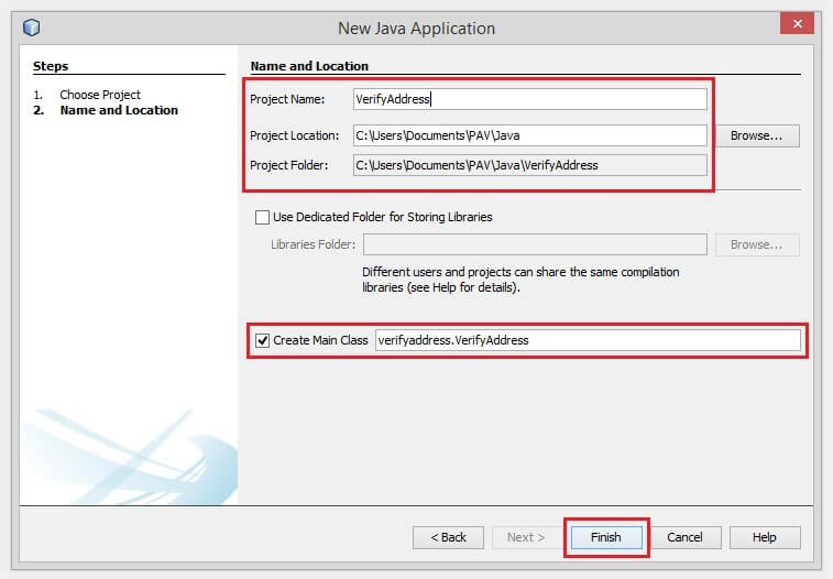c. Name your project. Select a Project Location and Project Folder. (Ensure the Create Main Class checkbox is selected.)