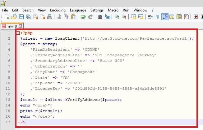 b. Add the request code for the VerifyAddress method of the API. (In this example we are using PHP with SOAP.)