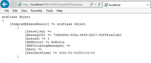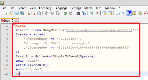 b. Add the request code for the SMS method of the API. (In this example we are using PHP with Soap.)