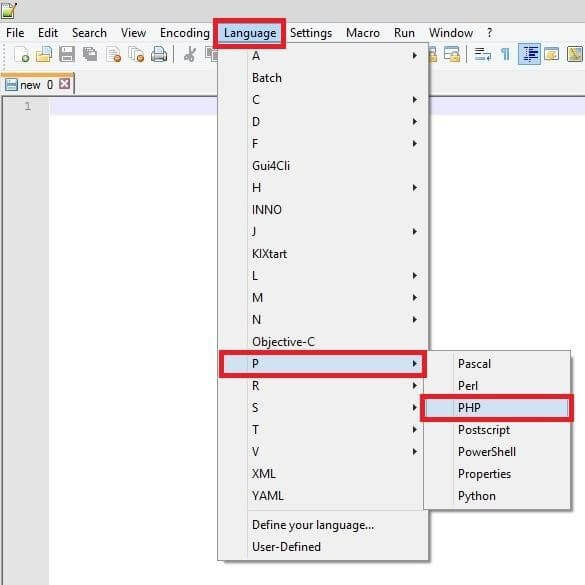 a. Start a new project within Notepad++. Select the menu item Language > P > PHP.