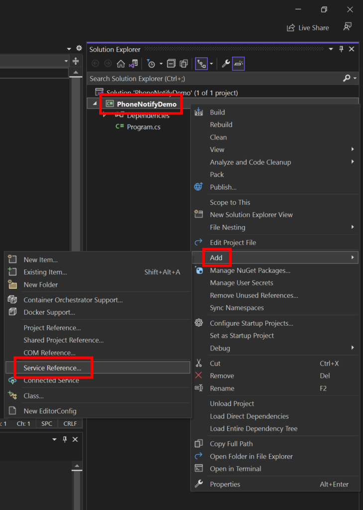 Start by creating a new Console App project in Visual Studio. Then, in the Solution Explorer, right click on your project and select Add > Service Reference….