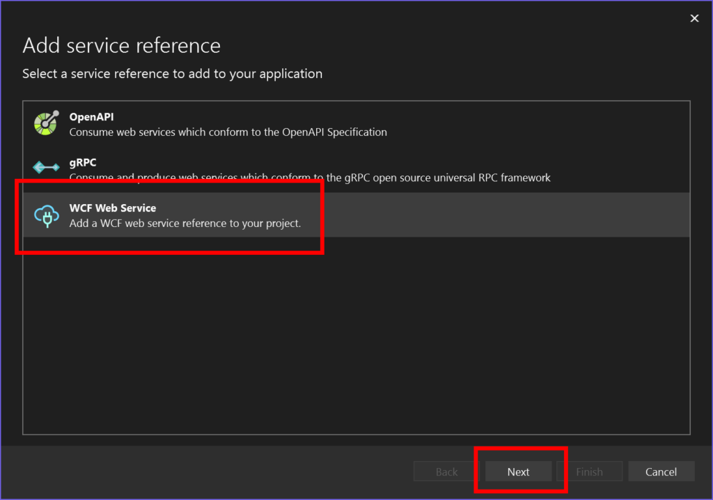 Visual Studio will open an “Add service reference” dialog. Select WCF Web Service and click the Next button.