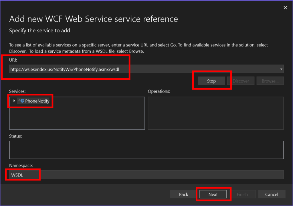 In the URI field, type in the URL for the Voice Broadcast API service description file: https://ws.esendex.us/notifyws/phonenotify.asmx?wsdl. Then click the Go button.