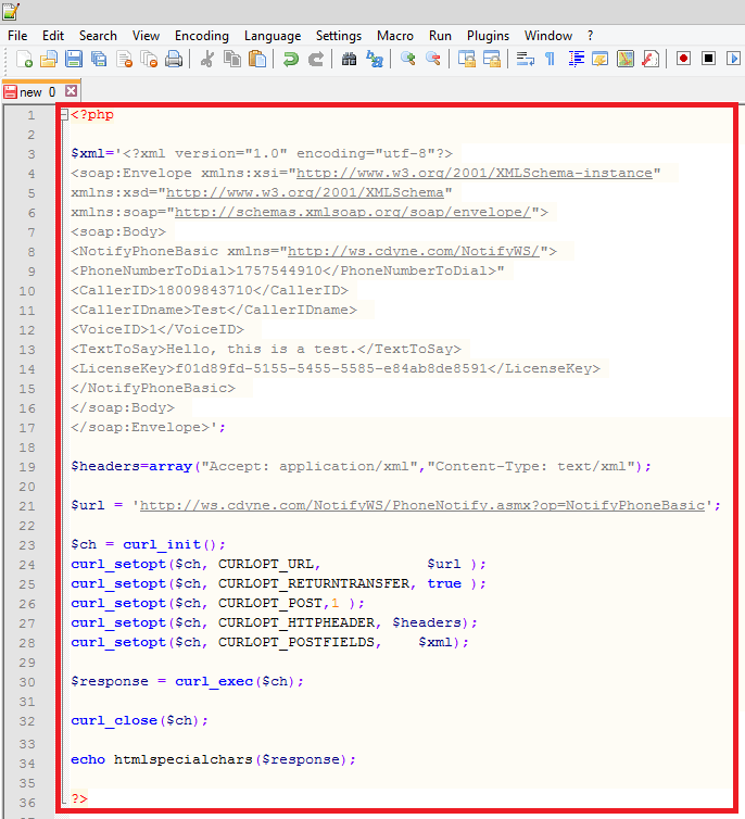 b. Add the request code for the NotifyPhoneBasic method of the API (In this example we are using PHP with cURL.)
