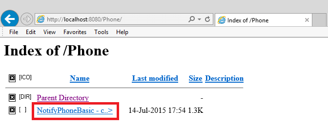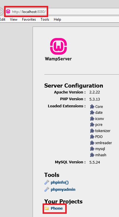 a. Navigate to your web development server in your browser and click on the project folder. (In this example we are using WAMP.)